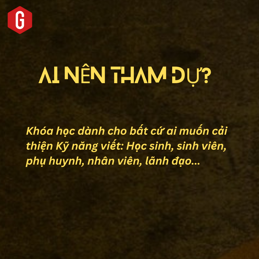 Khóa học dành cho bất cứ ai muốn cải thiện Kỹ năng viết: Học sinh, sinh viên, phụ huynh, nhân viên, lãnh đạo... Khi kết thúc khóa học, học sinh sẽ không còn sợ môn tập làm văn, cha mẹ biết cách đồng hành cùng con, nhân viên biết cách viết các văn bản làm việc nhanh và đúng cách.
